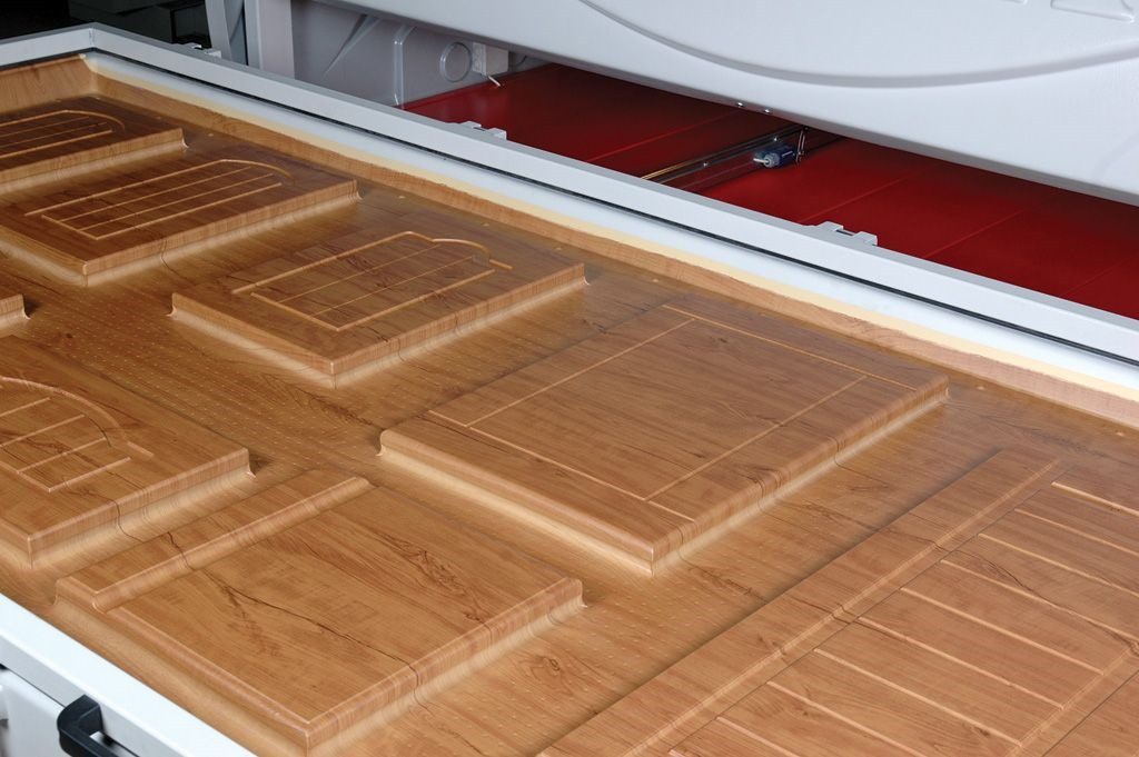 The vacuum table is the base for the processed material for further pressing operations. The vacuum pump draws air from the film covering, which is attached to the furniture workpieces. The clamping frame provides the tightness of the working area. The press cover can be made as a folding or rolling mechanism.