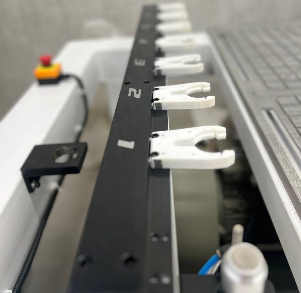 В базовой комплектации станка установлено 4 сменных инструмента в магазине. Это количество можно увеличить до 7 инструментов без внесения изменений в конструкцию. Для размещения еще большего количества инструментов требуется изменение расположения линейного магазина.