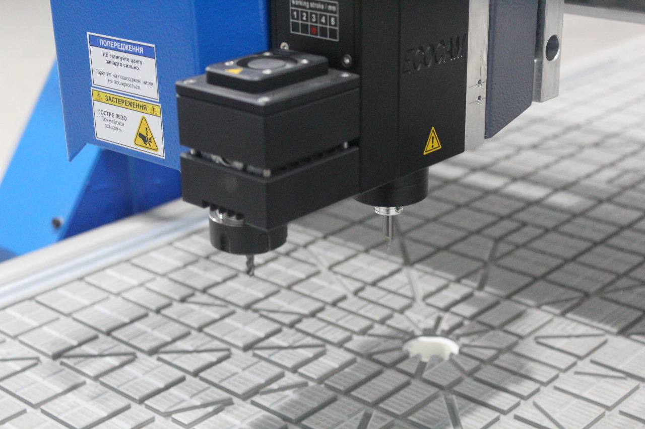 Уникальность этого станка состоит в том, что можно создавать управляющую программу с комбинированным использованием двух режущих инструментов: фрезерного шпинделя и ножа. Оба агрегата расположены на небольшом расстоянии друг от друга, что очень экономит время при чередовании их в процессе обработки. Продуманная конструкция обеспечивает быстрое переключение между рабочими агрегатами.